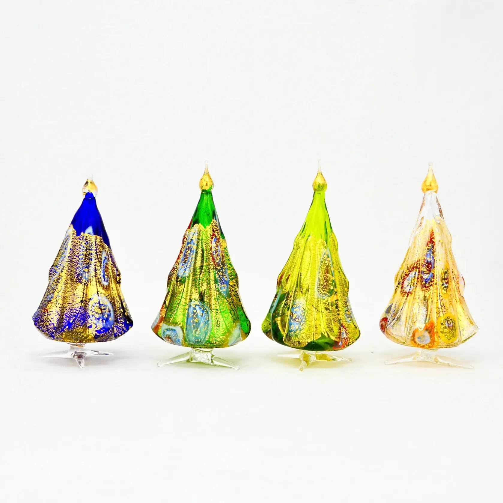The trees are made in three traditional Murano glass styles; Millefiori, Macchia, and Vento. The artisan starts with a solid color and then adds a second color just before the piece is fired. 24-karat gold foil is applied to give it a beautiful sparkly finish.